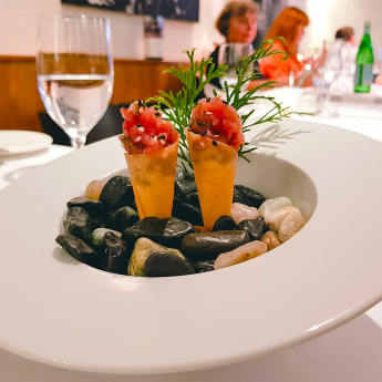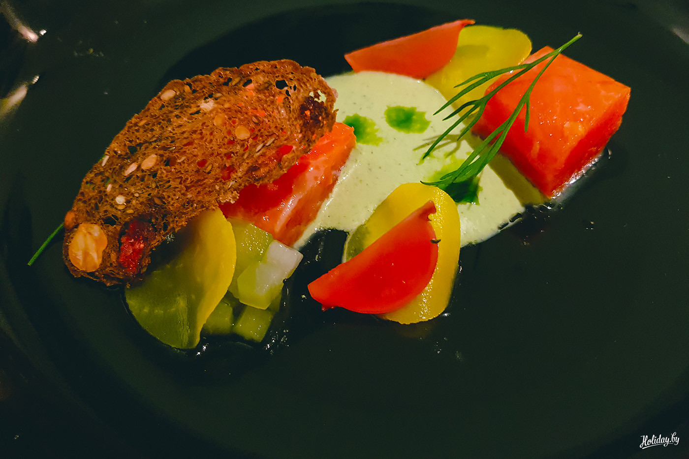 Ресторан рыбный. Заправляет тут шеф-повар Сергей Шипоров. В меню можно найти морскую и озерную рыбу. Мы заказали дегустационное меню. Его нет в официальной книжке, но, полагаю, о нём можно спросить у обслуживающего персонала. Стоимость такого меню составляет 50 евро на человека. Порции небольшие, но за счет этого можно наслаждаться каждым блюдом и не давать мозгу ни единого шанса пропустить какой-либо оттенок кушанья.