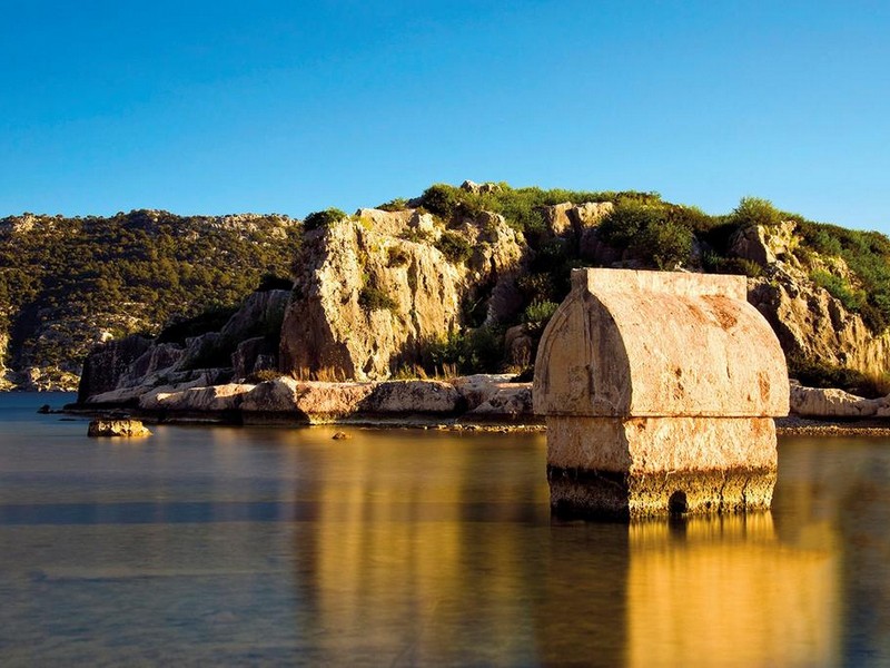 Город древней Ликии, едва заметный с воды и с берега, представлен выглядывающими на поверхность руинами торговых рядов. Симена, разрушенная землетрясениями во втором веке, привлекает к себе туристов на байдарках. А вот погружения к развалинам запрещены с 1986 года, чтобы защитить архитектурные памятники.