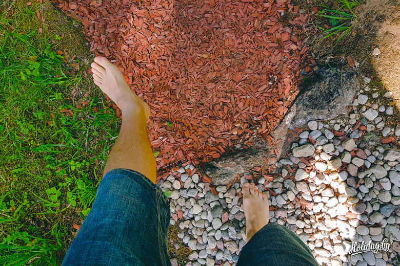 Стоит удовольствие открыть чакры от 4 до 9 евро на взрослого человека. Цена зависит от включения или нет в посещение финального ритуала с омовением ног и травяным чаем. Снимаете обувь и вперед массировать свои энергетические центры и познавать новые ощущения. Первые десять минут всё просто, а к прогулке относишься как к шутке. Идешь себе босиком по камушкам, шишкам, мягкому торфу. В какой-то момент выхватываешь взглядом табличку говорящую, что до финиша осталось примерно… 3 километра. Три километра!? А под ногами уже щебенка, острые корни деревьев, крупные доски…