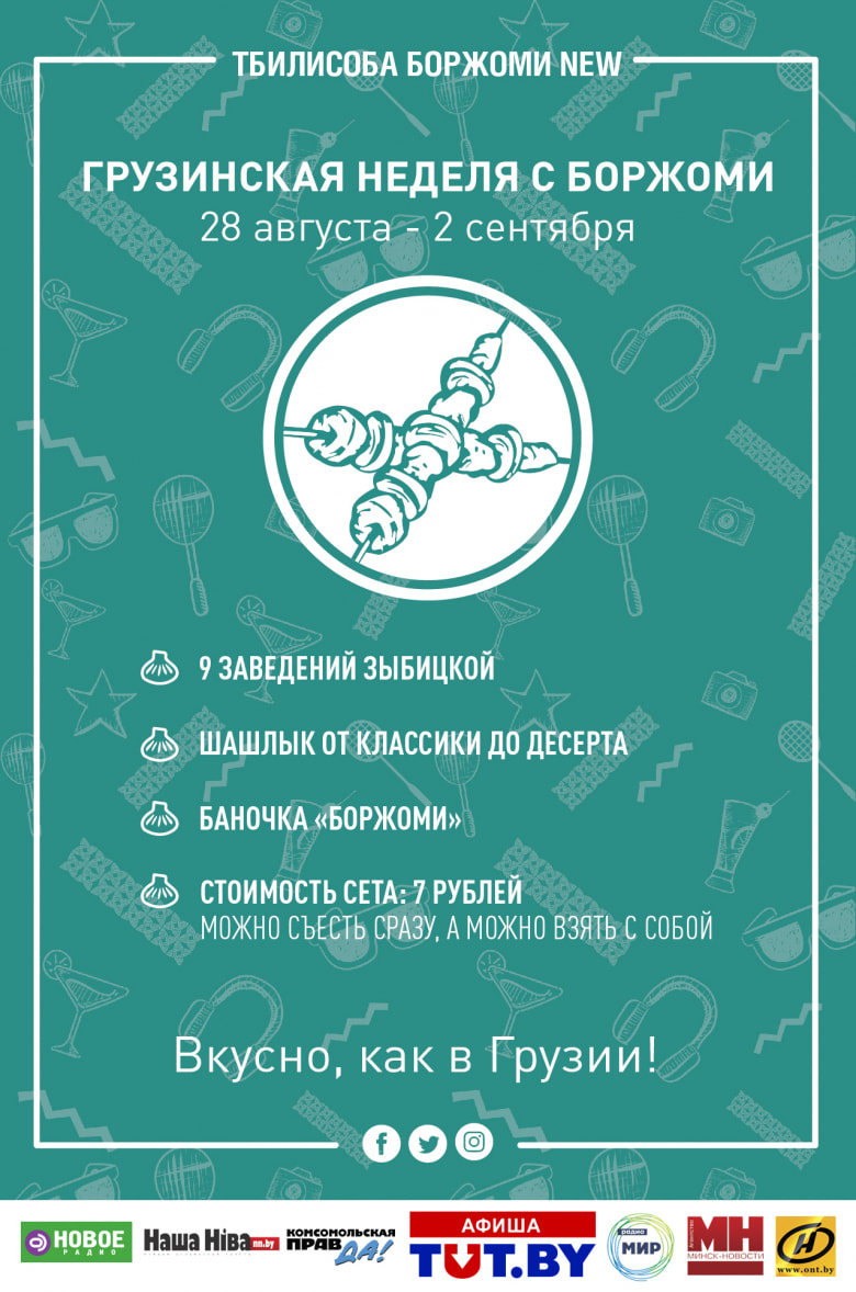 С 28 августа по 2 сентября прогулка по кафе и барам главной тусовочной улицы города впервые превратится в увлекательный гастро-тур, где всего за 7 рублей можно будет оценить размах грузинского гостеприимства. 9 модных заведений Зыбицкой и окрестностей в течение недели предложат новое видение традиционного шашлыка в преддверии масштабного фестиваля “Тбилисоба Боржоми 2017” , когда в Верхнем городе откроют самый большой грузинский фудкорт на 25 ресторанов и будут угощать грузинскими блюдами “по-новому” до полуночи.