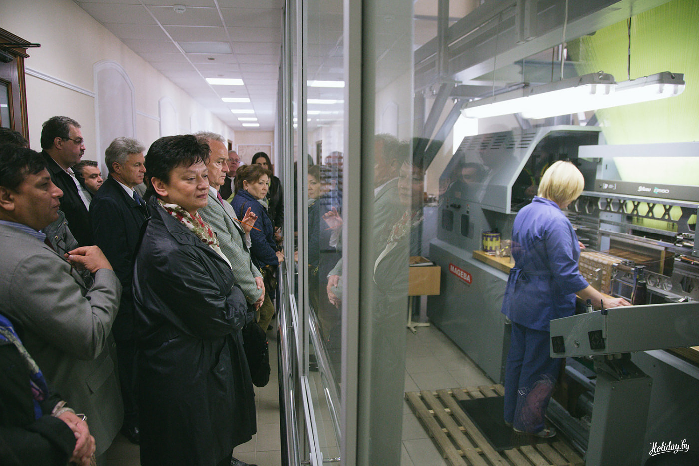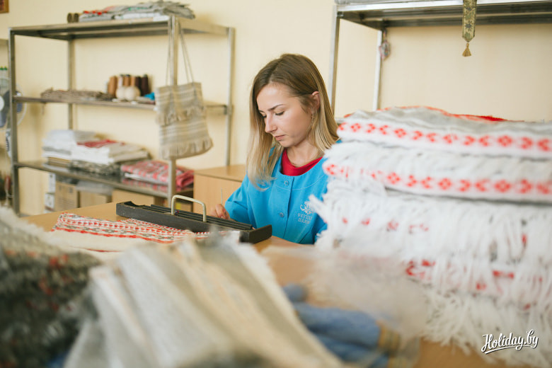 Оставляем представителей посольств осмысливать увиденное и составлять wish-листы, а сами отправляемся в цех переборного ткачества. Еще одна уникальная особенность фабрики «Слуцкие пояса»: передача техник ручной работы за счет личных средств предприятия (так сохраняется народная традиция). В 2012 году было приобретено 9 станков, трудоустроены и обучены двенадцать ткачих. Такая своеобразная мануфактура XXI века.