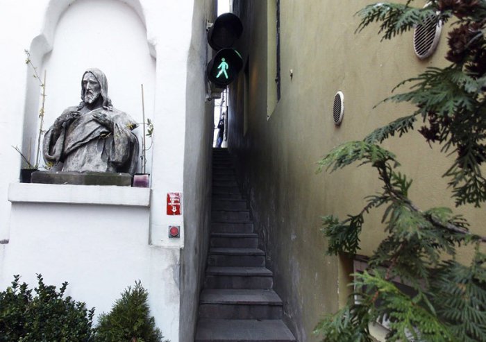 8) В Праге есть проход между домами шириной 70 сантиметров, в котором висит настоящий светофор. Но работает он не для машин, а для того, чтобы идущие с разных концов улицы прохожие не натолкнулись друг на друга. Часть источников называет этот проход улицей Винарна Чертовка, но это не официальная улица — просто таким образом находящаяся неподалёку пивная «Чертовка» сделала себе рекламу.