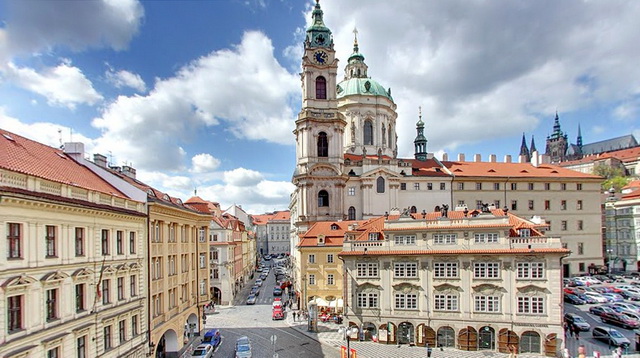 В Праге два собора в честь святого Николая, или Микулаша, как ласково произносят чехи его имя. Один храм находится на Староместской площади, но мы говорим не о нём. А вот второй, на Малостранской площади - тот самый. И на его башне тоже устроена смотровая площадка. Сама башня только стоит впритык к собору, но отношения к нему не имеет. Она была сооружена и всегда служила в качестве охранного объекта.С балкона гости Праги могут обозревать окрестности и любоваться крышами и улицами, глядя на них с непривычной высоты.