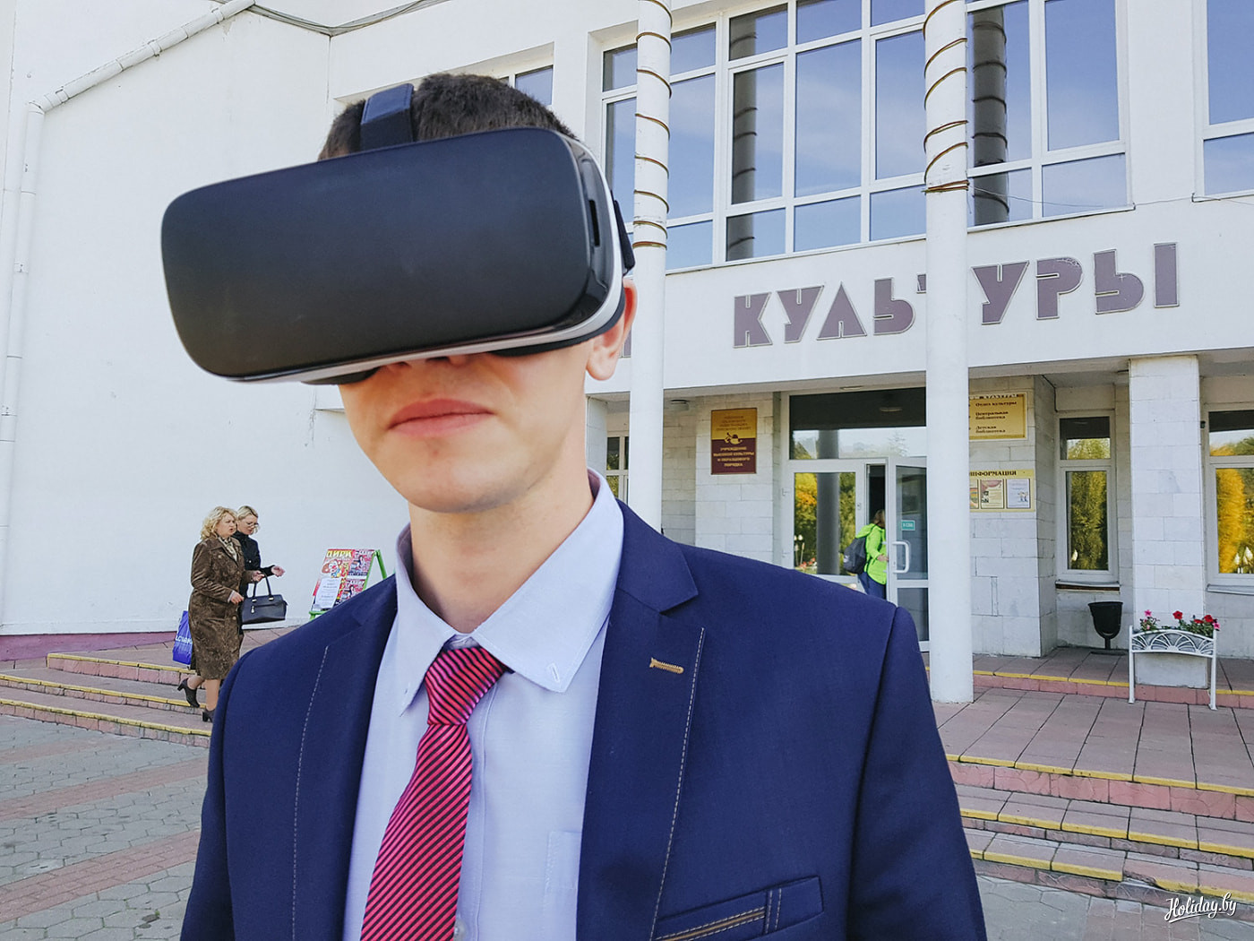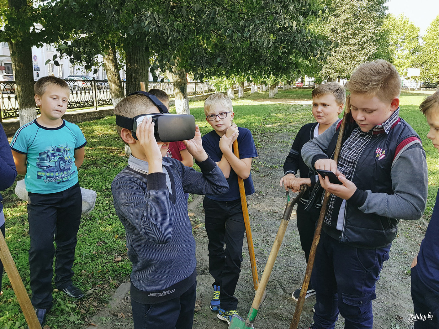 Наверное, со стороны мы выглядим очень забавно: три парня и девушка бродят по городу и пытаются поговорить с людьми. В руках — VR-очки Samsung, блокнот и камера, в глазах — скорбь всего белорусского народа. Мы грустим, потому взрослые жители Шклова и вправду мало где бывали.