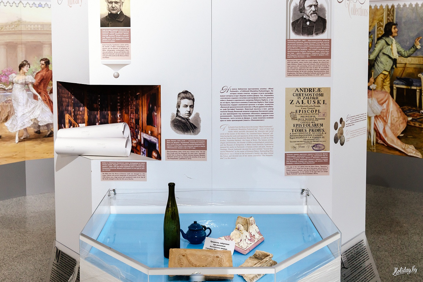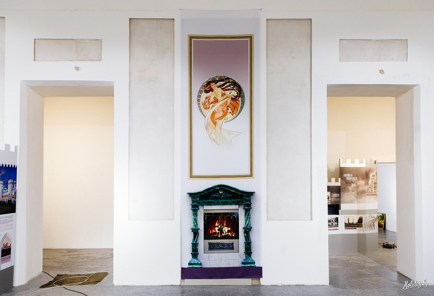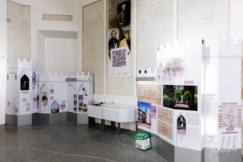 Самая большая экспозиция представлена в центральном Белом зале. Он оформлен баннерными растяжками с историческими ремарками про судьбу дворца в XX веке. Красивая история завершилась вполне в духе времени: наследник рода проиграл поместье в карты. Во время Первой мировой усадьба была разграблена, а в 1944 году при наступлении партизаны обложили строение хворостом и подожгли.