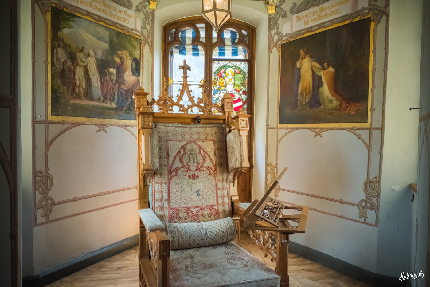 Виды на миллион гульденов из каждого окна. Не пропитаться насквозь рыцарскими легендами тут невозможно, если представить, что Людвиг Второй проводил тут большую часть времени в году. Именно в зале героев, говорят, у новоиспечённого короля Баварии и родилась идея построить напротив Хоэншвангау новый замок – Нойшванштайн. С одного из балконов старого замка король наблюдал за разворачивающимся на соседней горе строительством.