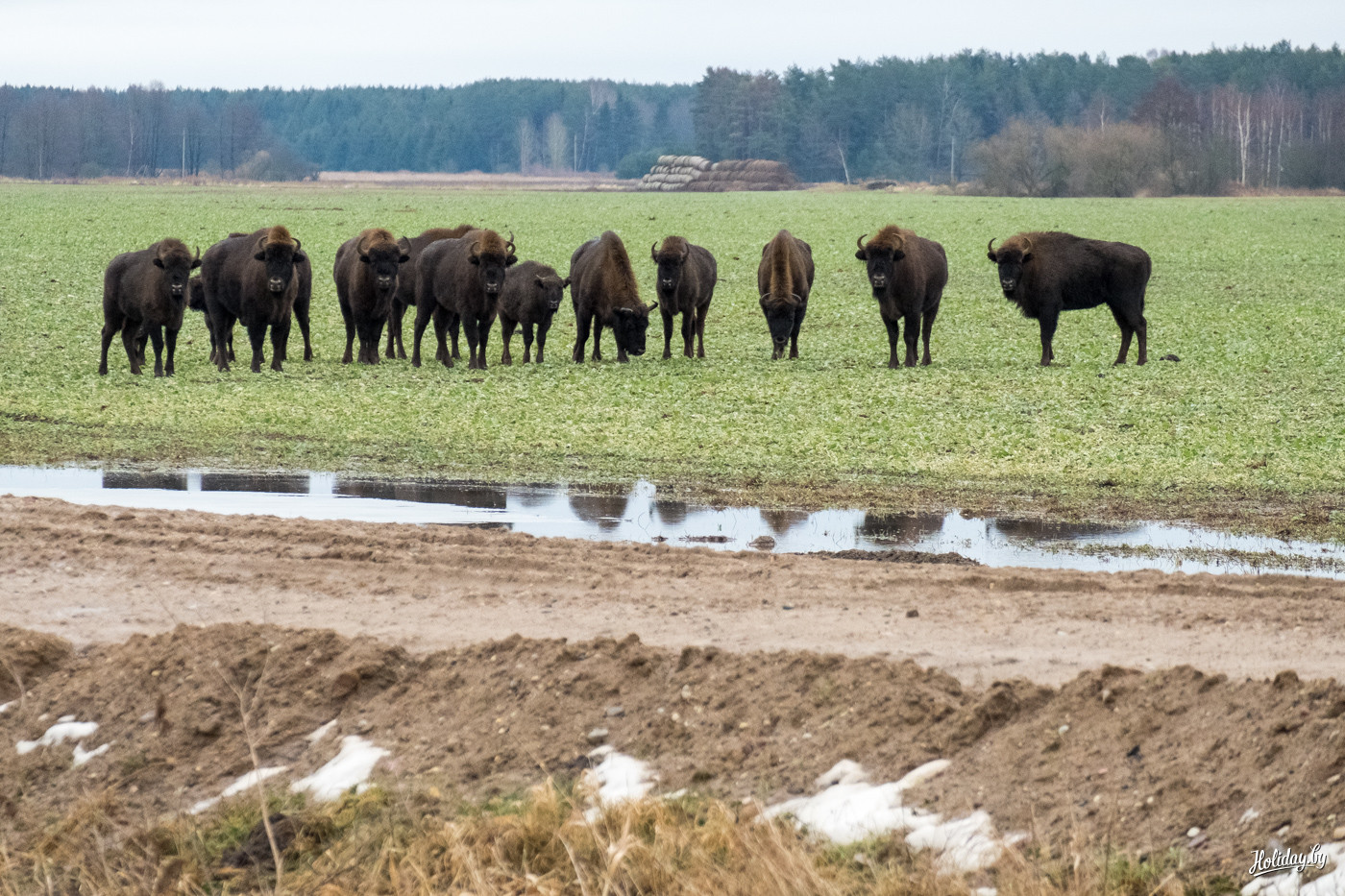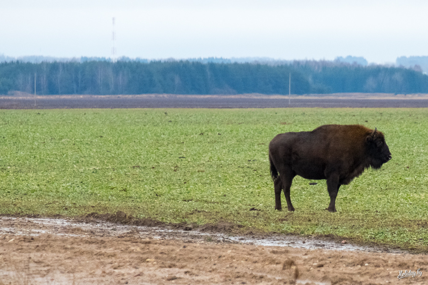 Казалось бы, что в этом такого – езжай в зоопарк и смотри сколько хочешь на лохматого исполина. На такие «городские» мысли наталкивает пейзаж – где-то на горизонте виднеются фуры, которые идут по Гродненской трассе. Но стоит повернуться к цивилизации спиной, как перед глазами только лес, поле, а на нём голов двадцать диких зубров.