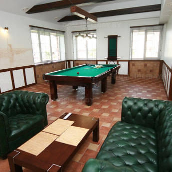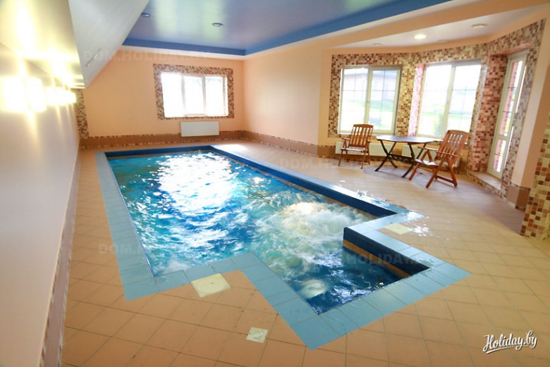 Главный коттедж на сутки (площадь 340 квадратных метров) вмещает около двадцати двух человек, на ночь смогут остаться 8 (четыре двуспальных кровати). На первом этаже находятся каминный зал, прихожая, бассейн и сауна, санузел. Зона отдыха расположена на втором этаже. Здесь к вашим услугам 3 спальни, кальянная и душевая.