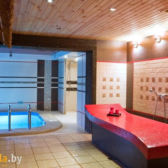 Коттедж «Sun-House» отличается от других не только уникальным дизайном, но и уютной продуманной обстановкой. На первом этаже помимо самой сауны расположен бассейн с подсветкой (площадь -14 квадратных метров), гейзер, гидромассаж.