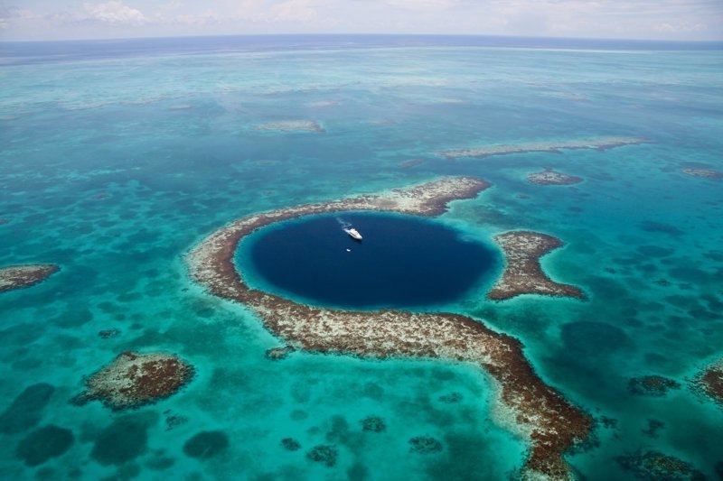 Начинаем наше путешествие по планете и первым местом, куда мы отправляемся - место, которое находится в Карибском море в 96 км от небольшого государства Белиз, Центральной Америки. Большая голубая дыра - одно из геологических чудес вблизи полуострова Юкатан, представляющее собой круглую воронку диаметром 305 м и 120 м в глубину. Предполагается, что данное геологическое образование изначально являлось системой известняковых пещер, сформировавшихся в ходе последнего ледникового периода. Уровень моря тогда был значительно ниже, но когда океан поднялся и свод затопленной пещеры обвалился, образовалась карстовая воронка. В результате сильного перепада глубины, вода в голубой дыре значительно темнее.