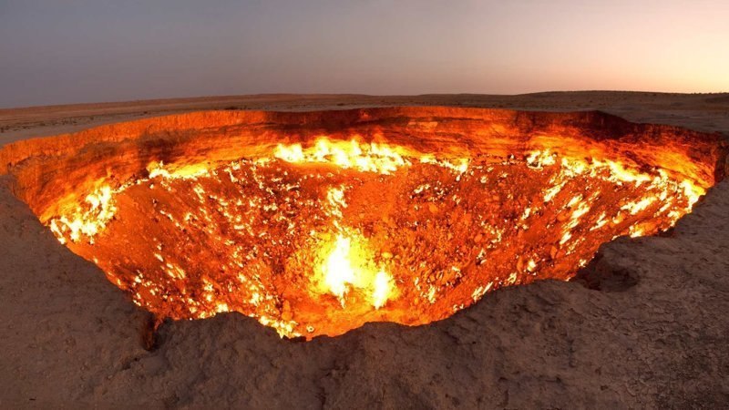 А теперь переместимся в таинственное и странное место в Туркменистане, находящемся в 90 км от аула Ербент. Кругом пустыня и вдруг среди песков кратер, из которого вырывается пламя. Это газовый кратер, диаметром приблизительно 60 метров и глубиной около 20 метров. Местные жители и путешественники называют его «Дверью в преисподнюю» или «Вратами Ада».