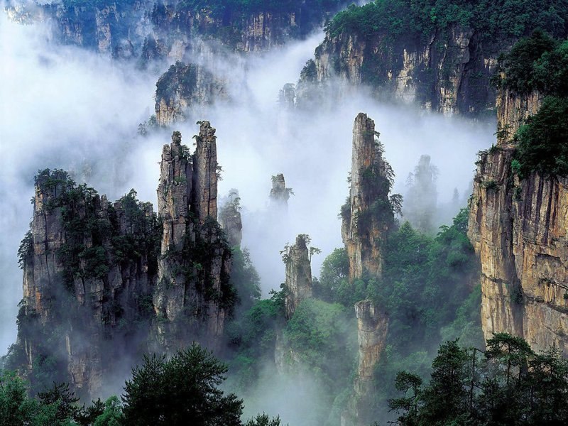 А теперь на юго-восток Китая, в провинцию Хунань, где находится потрясающая достопримечательность – горы Улинъюань. Место знаменито своими кварцитовыми скалами, высотой до 800 метров. Горы представляют собой живописное зрелище: огромные каменные столбы над тропическим лесом, изрезанные острые вершины, водопады, гигантская система пещер, мощные реки.