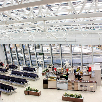 Она расположена напротив входа в здание аэровокзала, сектор 3–4 около фонтанов.