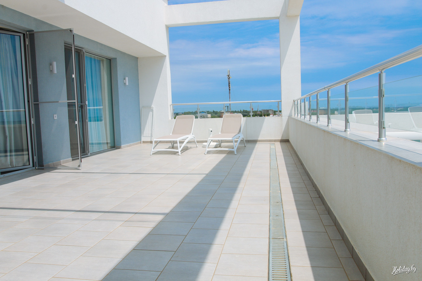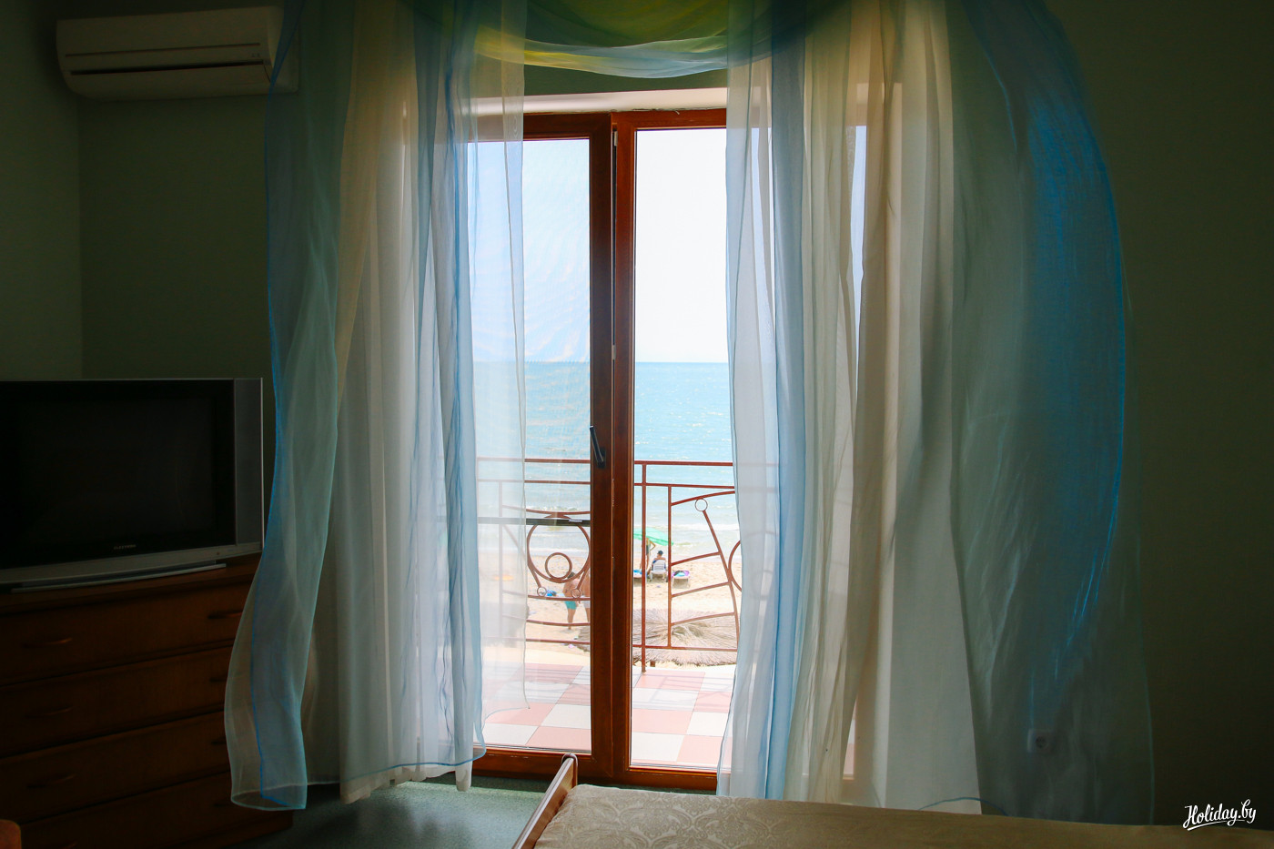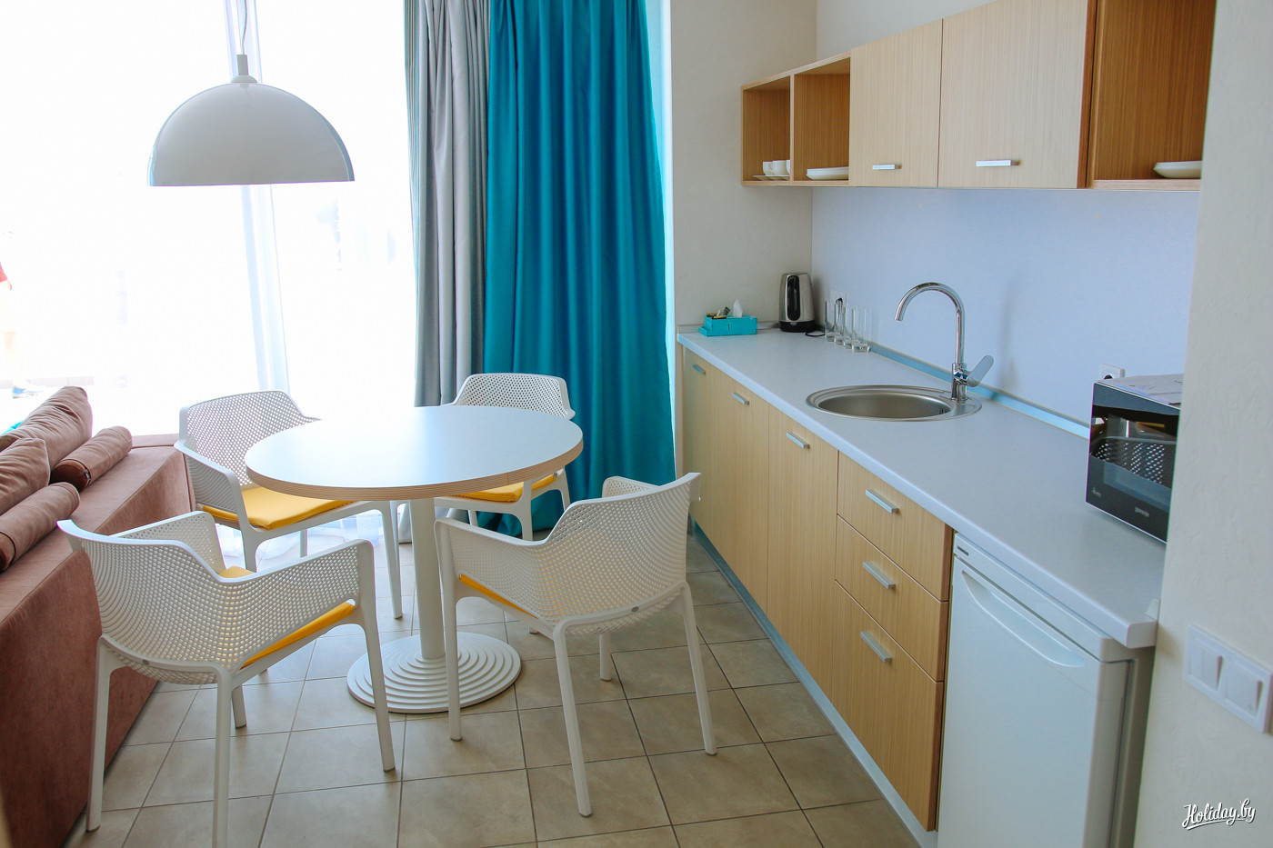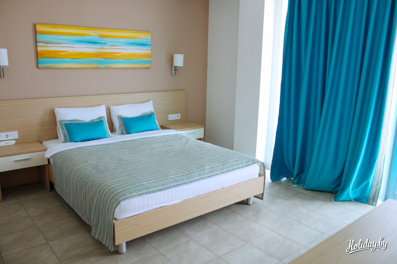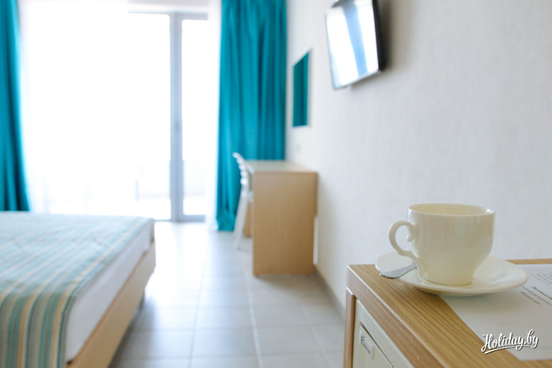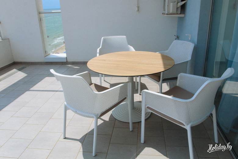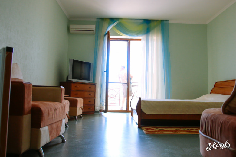 Наоборот, всё новенькое, мягенькое, беленькое, работает и всё просто хорошо. Даже в стандартах есть мини-кухня, что очень актуально на курортах. На верхних этажах разместились номера «Люкс» с видом на море и будущее благоустройство территории.