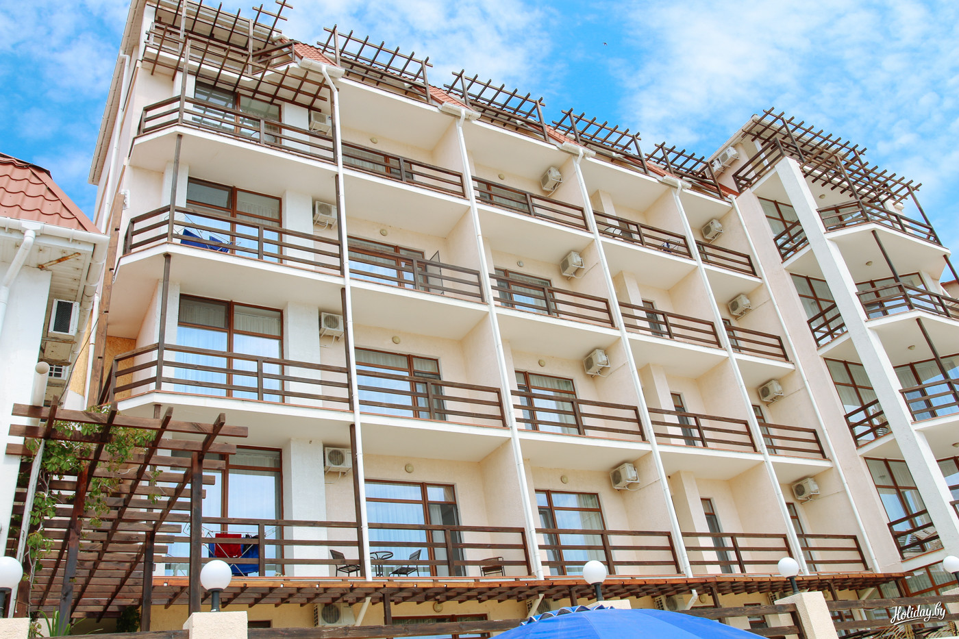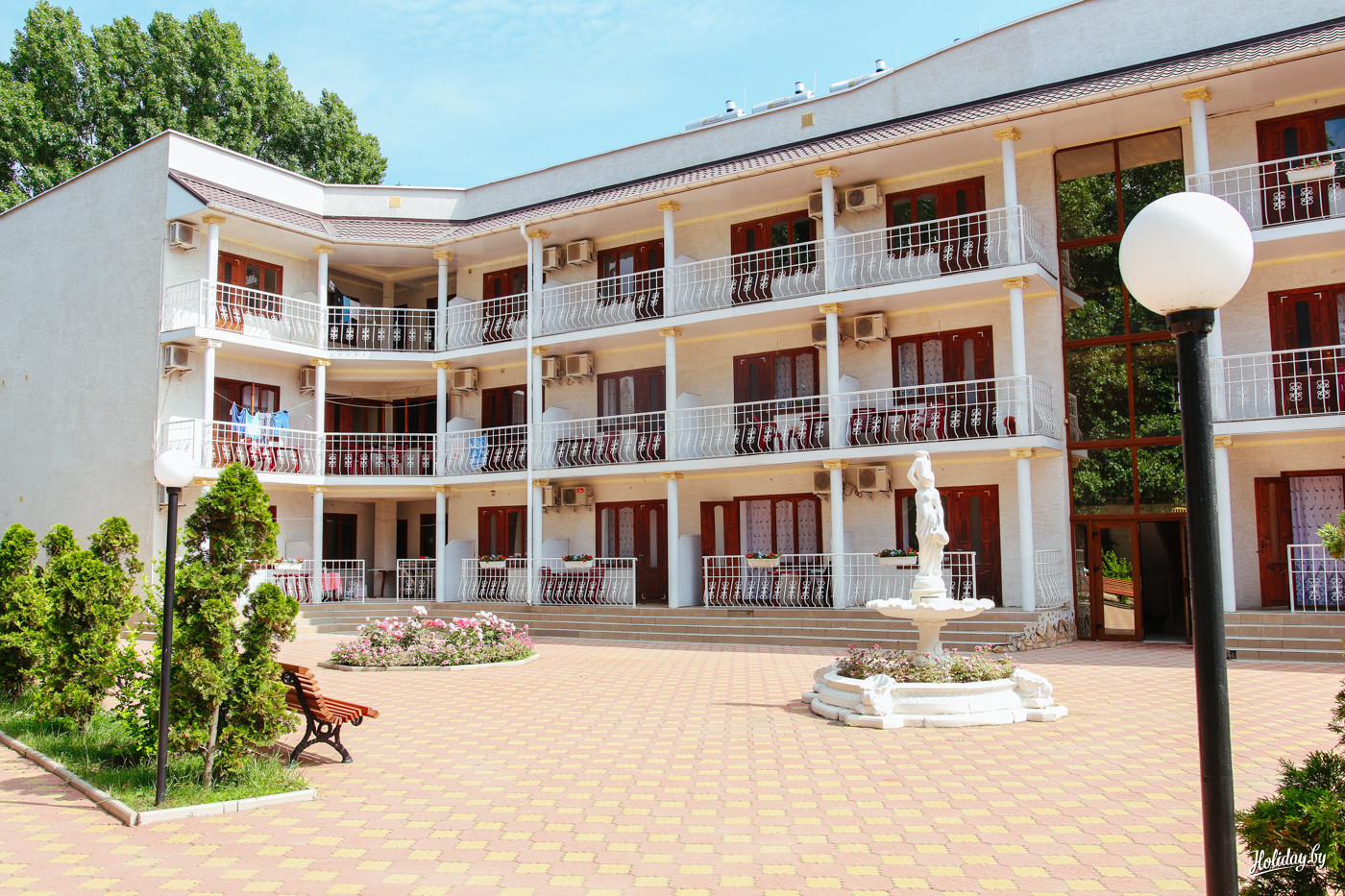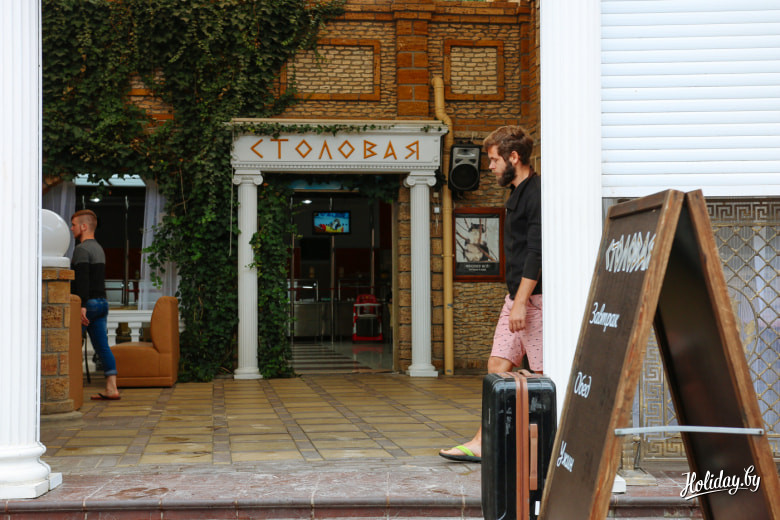 Первым делом интересуюсь у администратора, поселят ли меня просто на сутки с ночёвкой. Ответ отрицательный, но на все выходные и больше – без проблем. Типичные для постсоветских курортов двухэтажные корпуса поддерживаются в хорошем состоянии.