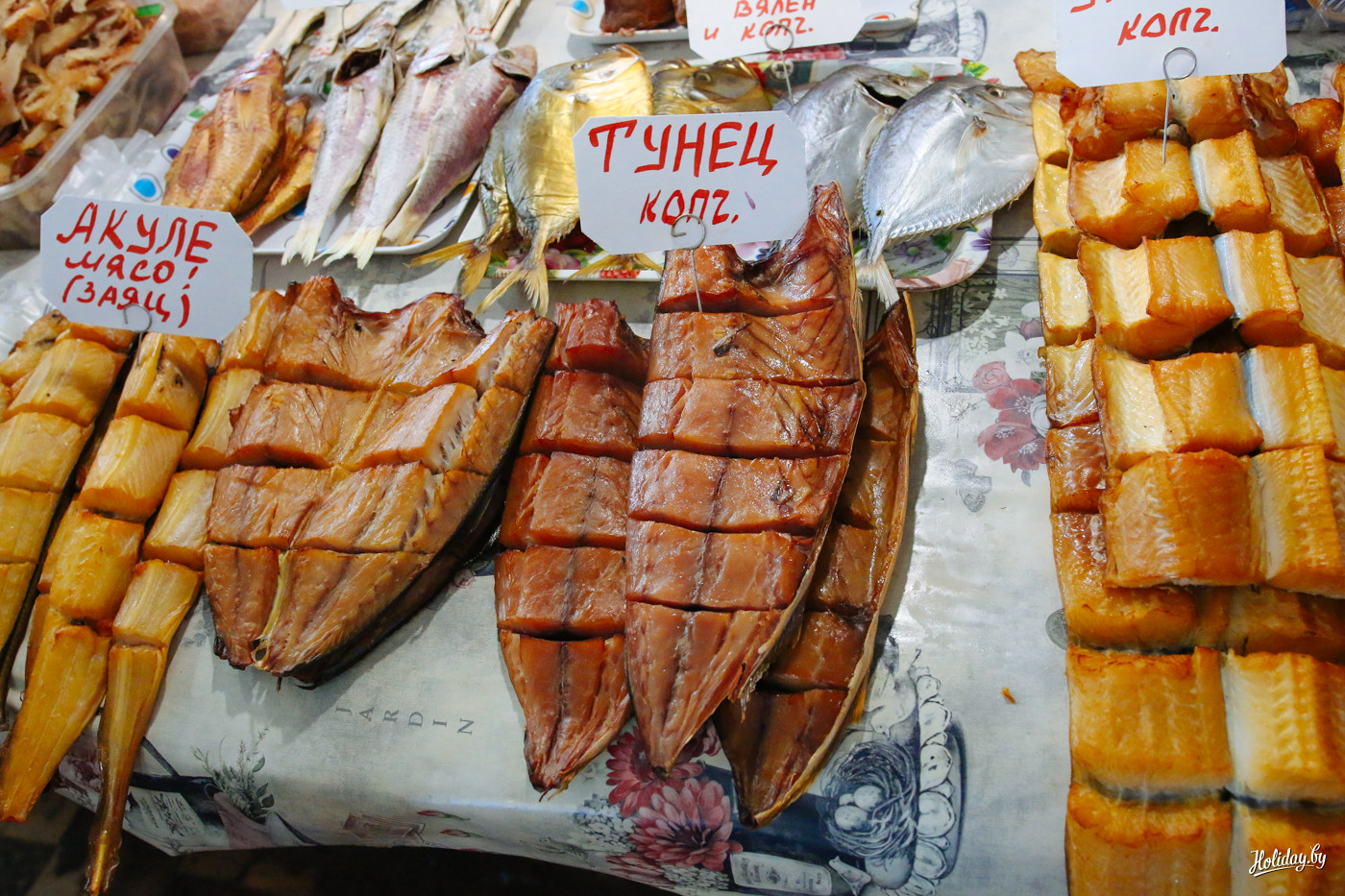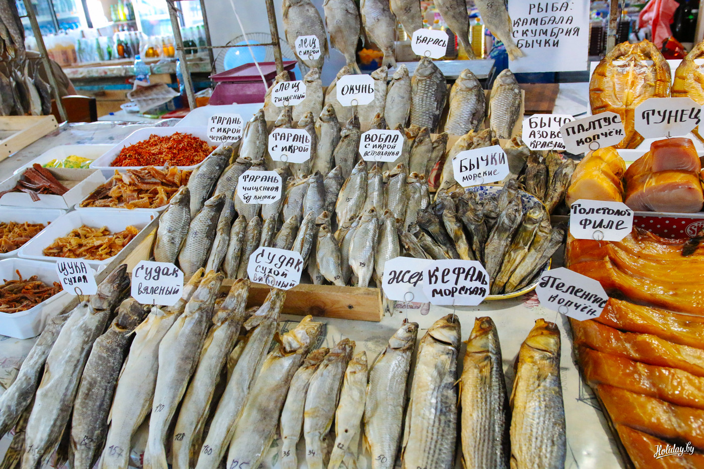 Этот местный «Привоз» находится аккурат неподалёку от отеля «Монкастро». От всего этого разнообразия сразу же урчит в животе. Но просто взять и купить себе полкило кальмаров или местных мидий нельзя.