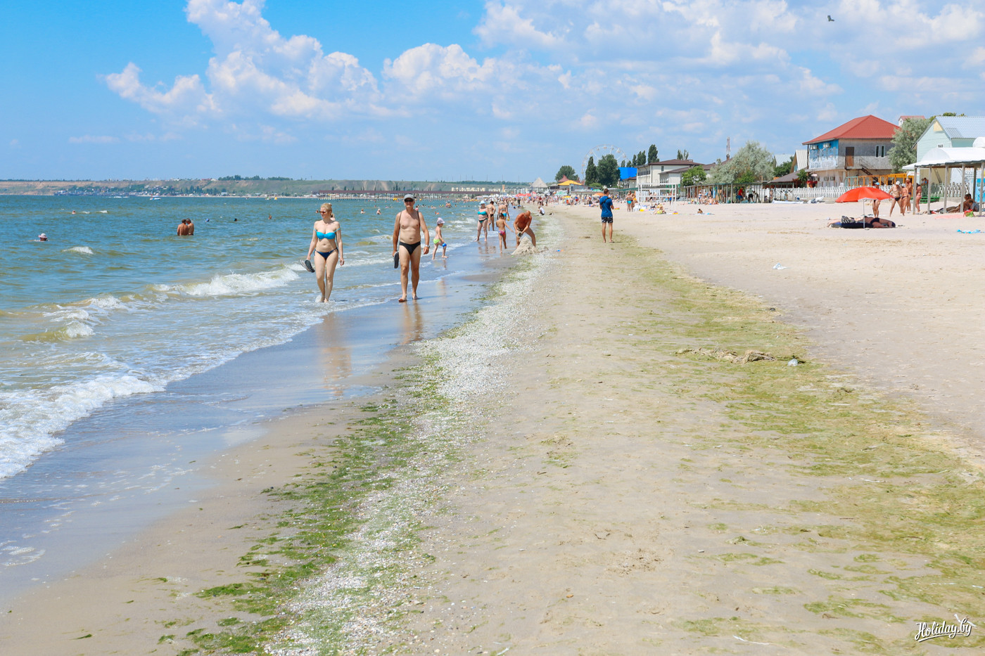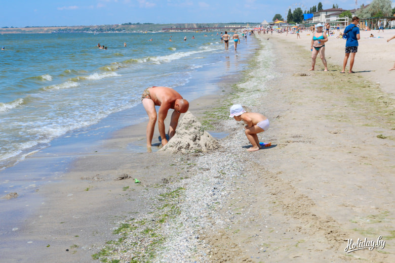 За первую минуту у меня в руке очутилась свежая пахлава и флаер на вечернюю дискотеку в одном из клубов на первой линии. В море много водорослей, но это не останавливает детей и взрослых от купания. Тем, кому претит зелёная субстанция в воде – прямая дорога в один из аквапарков Коблево.
