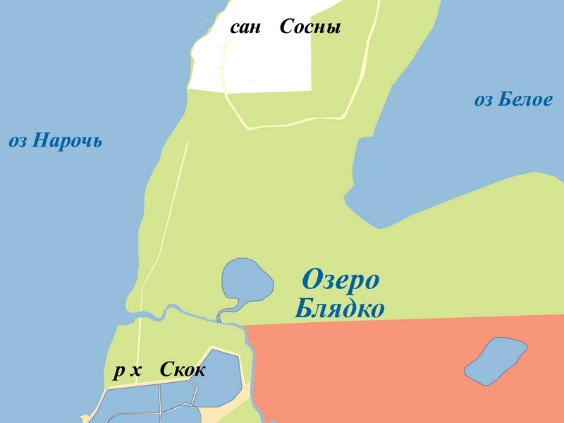 Это озеро если чем-то и интересно, то, в первую очередь, своим названием. Правда, порой в путеводителях Нарочанского национального парка оно порой обозначается как «Местное» или «Без названия». Озеро Блядко (на белорусском — Блядка) находится на самой границе заповедной зоны. Неизвестно, за что водоем получил такое неблагозвучное название. С одной стороны по берегу — заболоченный лес, с другой — болото, что создает труднодоступность. Само собой разумеется, что для пляжного отдыха оно не подойдет, разве что для рыбалки, если удастся добраться до воды по зыбкому мху.