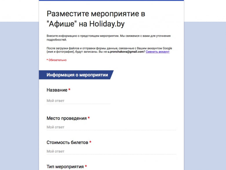 Как только мы получим заполненную форму, то достаточно быстро поймем, насколько ваше мероприятие соответствует ценностям Holiday.by. Если все хорошо, то информация в самое ближайшее время будет добавлена на сайт.