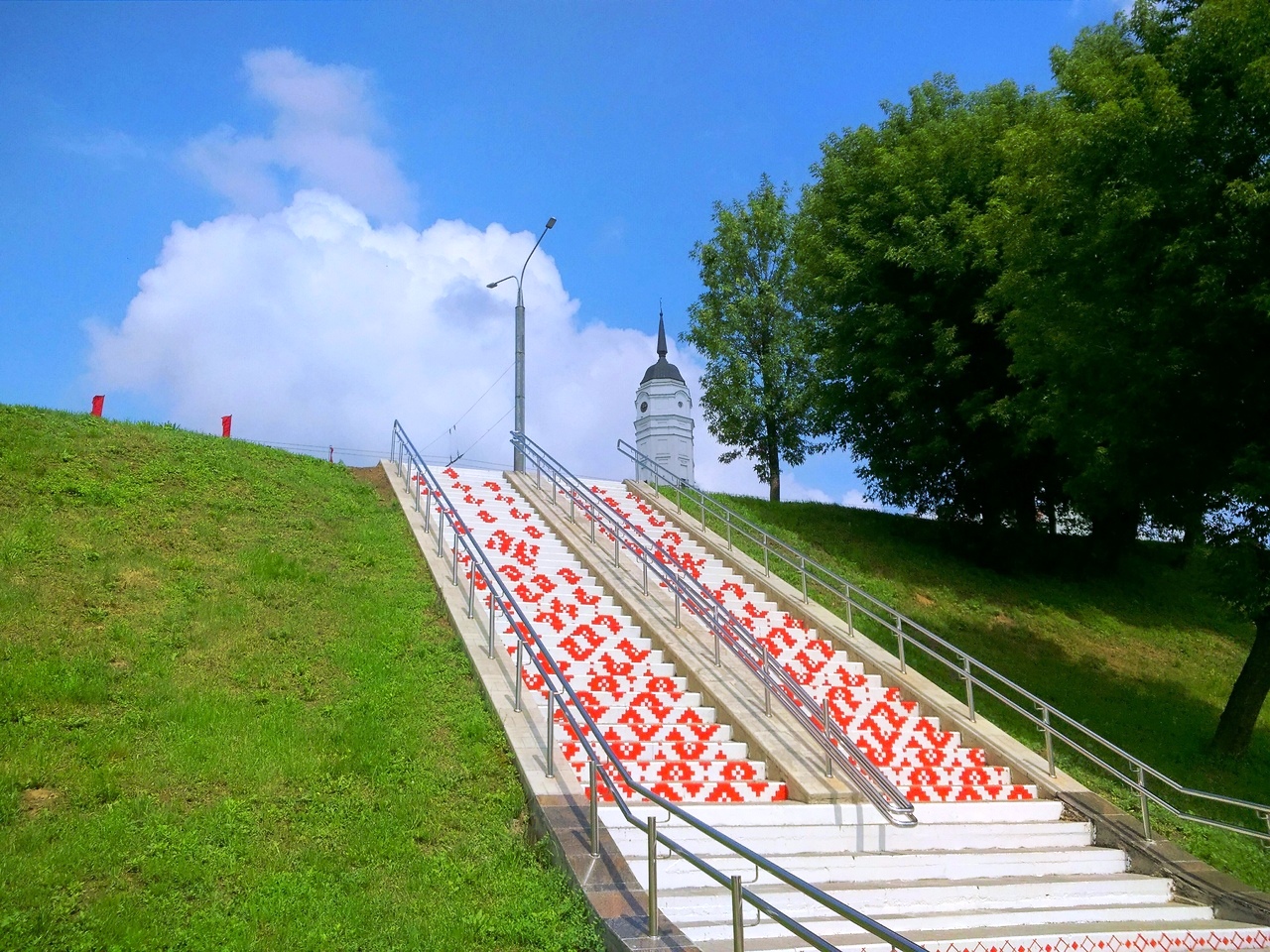 Одна из многочисленных лестниц города, благодаря энтузиазму местных жителей, стала популярным арт-объектом, который привлекает людей своим ярким белорусским орнаментом и креативностью исполнения.