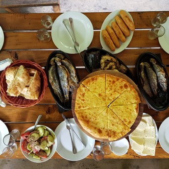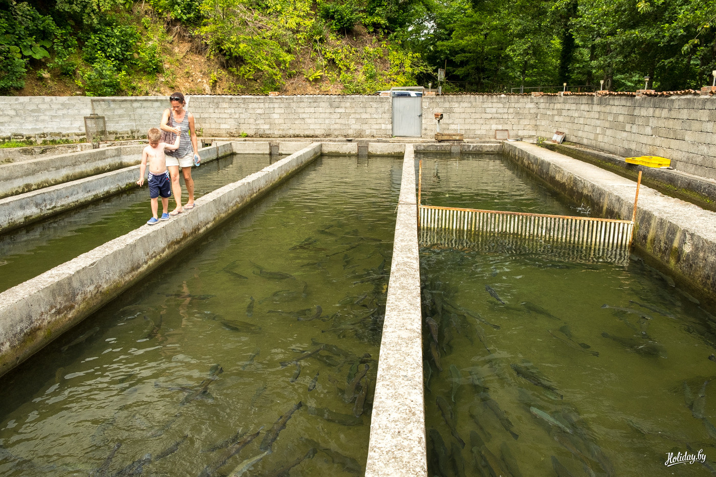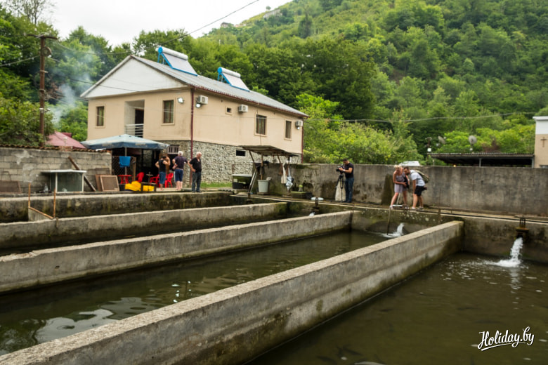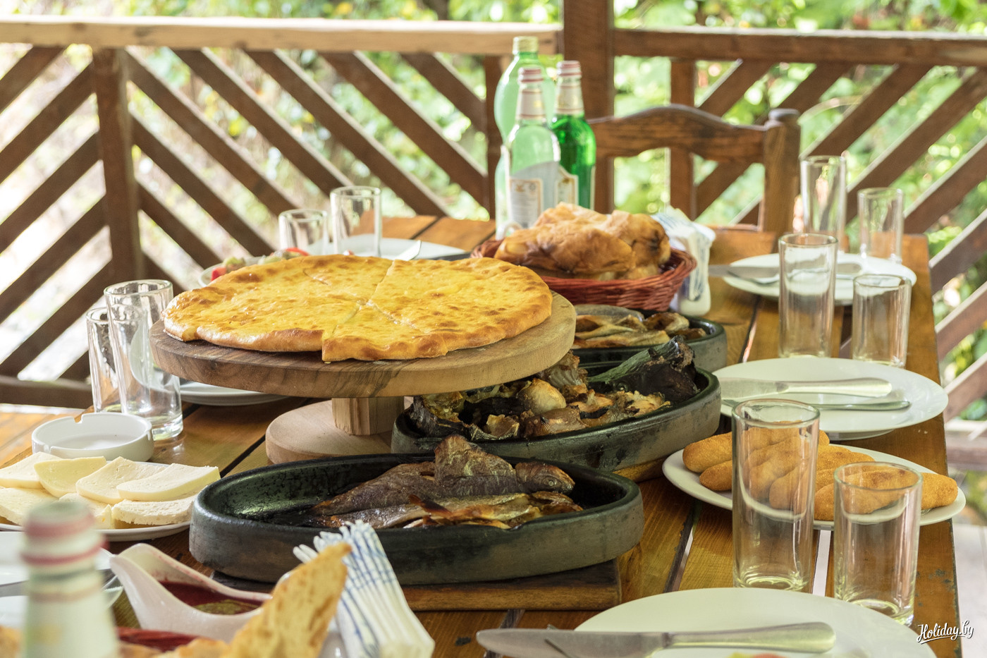 В аджарских горах много прекрасных кафе, где можно попробовать свежую рыбу. Мы заехали в деревню Кохи на рыбное хозяйство «Коброни». Здесь работает форелевая ферма и выращивают осетра. Рыбу туристам предлагают выловить из бассейна самостоятельно. Её тут же приготовят в специальнйо печи с минимумом специй. Это очень вкусно!