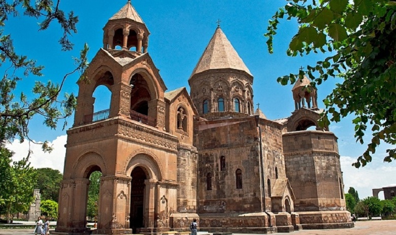 На этом месте в 303 году, где находился древний языческий храм, и была заложена церковь, названная Эчмиадзином, что по-армянски означает «место сошествия Единорожденного».