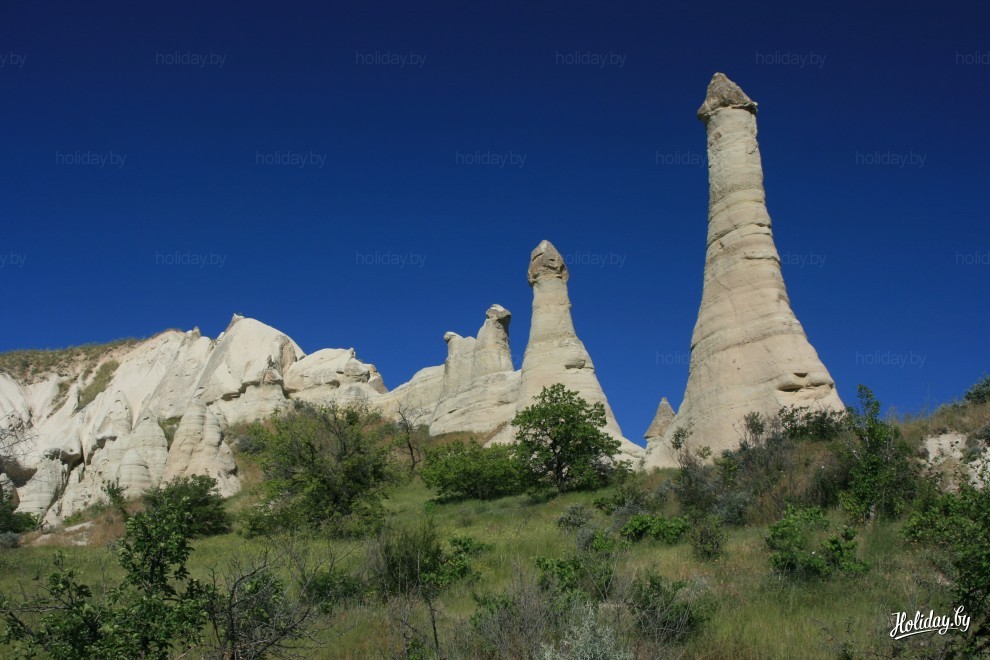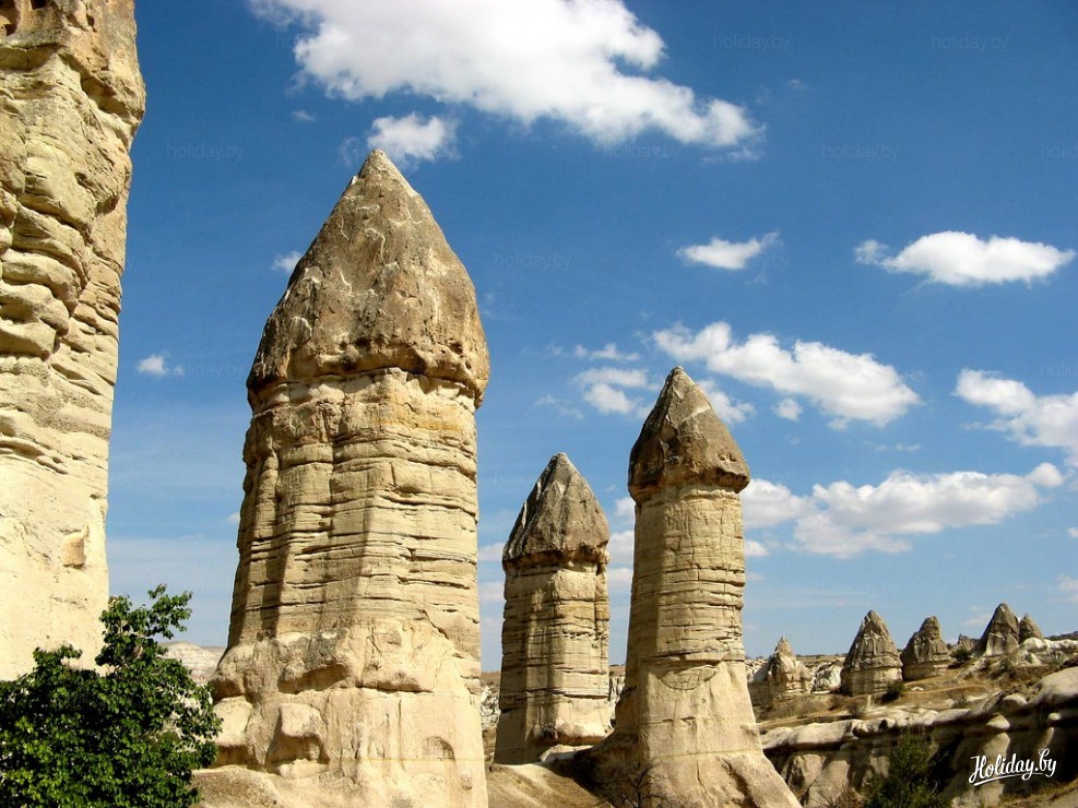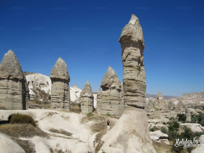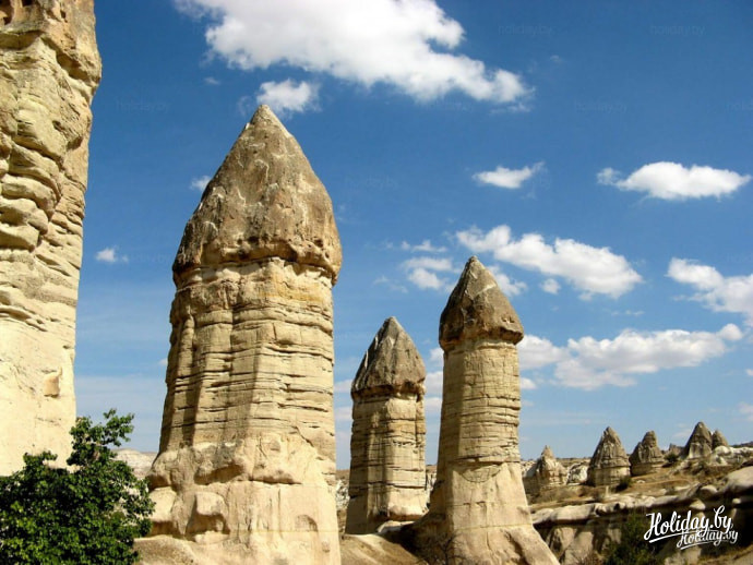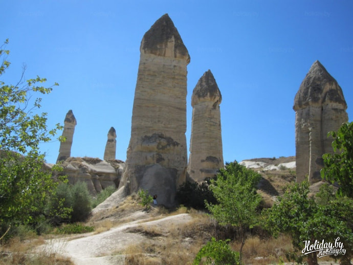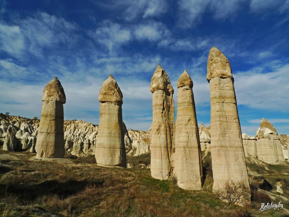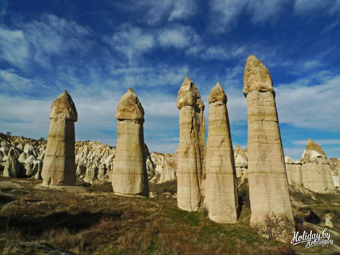 По поводу чуда света, - это ещё вопрос нерешённый, а вот чудо природы гарантированное. Эти необычные скальные скульптуры действительно созданы самой природой. Поговаривают, правда, ещё и об инопланетном происхождении, но это для фанатов уфологии. Нам же нравится земная версия происхождения каменных фигурок. Много миллионов лет назад в этой местности бушевали вулканы, извергавшие тонны пепла и лавы, которые покрыли километры скал и долин. Затем под воздействием атмосферных осадков и ветров более мягкие каменные породы вымывались и выветривались, а те, что попрочнее выступали на поверхность. Так и образовались перибаджалары – скалы-столбы с «шапками» на вершинах. Самые причудливые фигуры находятся в Долине любви.