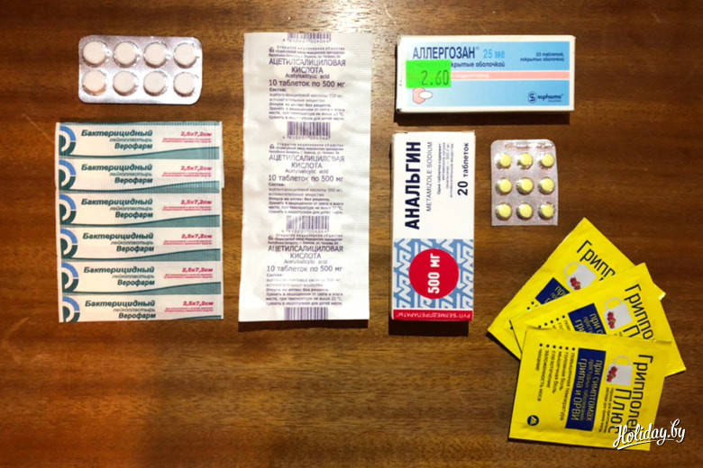 Обычно в поездку Алена берет обезболивающие лекарства, таблетки против аллергии и порошки на случай простуды. Весь набор можете увидеть ниже. Найти его можно в любой аптеке. В среднем выйдет около 15 BYN.