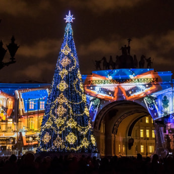 Дворцовая площадь – самая красивая площадь России и одна из красивейших в мире. В декабре на ней традиционно украшают главную городскую ёлку. Всю новогоднюю ночь здесь идет большой праздничный концерт, сопровождающийся красочным фейерверком.