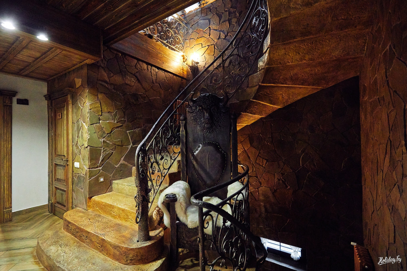 Работники усадьбы ходят в костюмах того времени, вместо ковров здесь шкуры животных, все декорации ручной работы, а в центральном холле стоит железный трон с головой зубра.