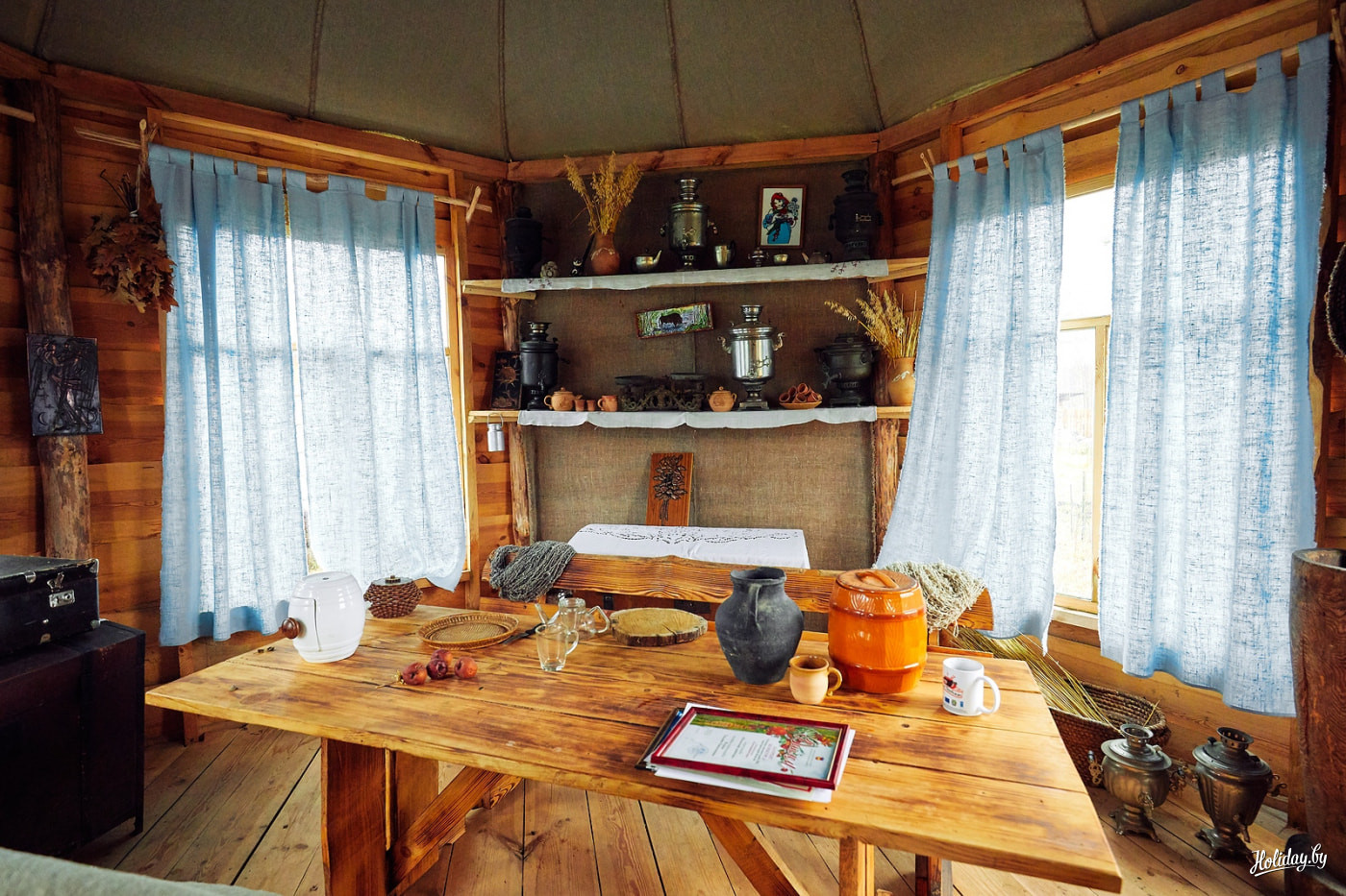 Все дома гармонично сочетают в себе сельский колорит и современность. На деревянном комоде располагается телевизор, в холодильнике стоит hand-made варенье, рядом с часами на стене висят вязаные лапти, самовар нагревается от розетки. Разве что с печкой все по-старому: треск дров, дымоход и теплый угол с плетеными покрывалами.