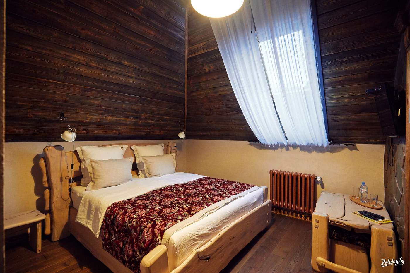 Скромное с улицы по размерам “Беловежское поместье” сильно углубляется во внутренний дворик. Гостей ждут изысканные апартаменты в стиле “сельского быта”: дощатые стены, ручники, самовары, глиняные горшки, плетеные фигурки и печка. Проживание для одного человека за сутки обойдется в 63.49 BYN (30$), для двоих – в 84.66 BYN (40$).*