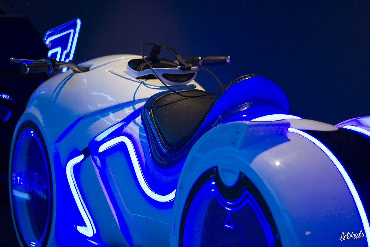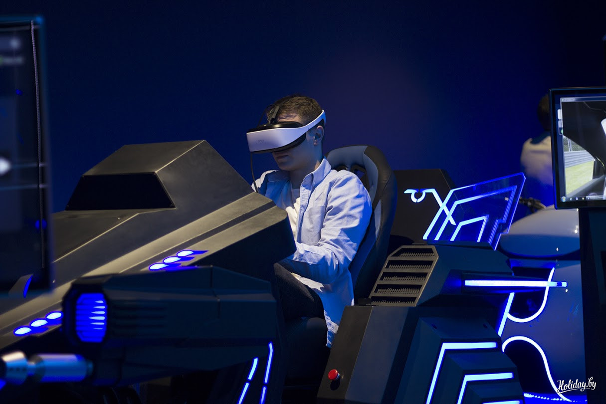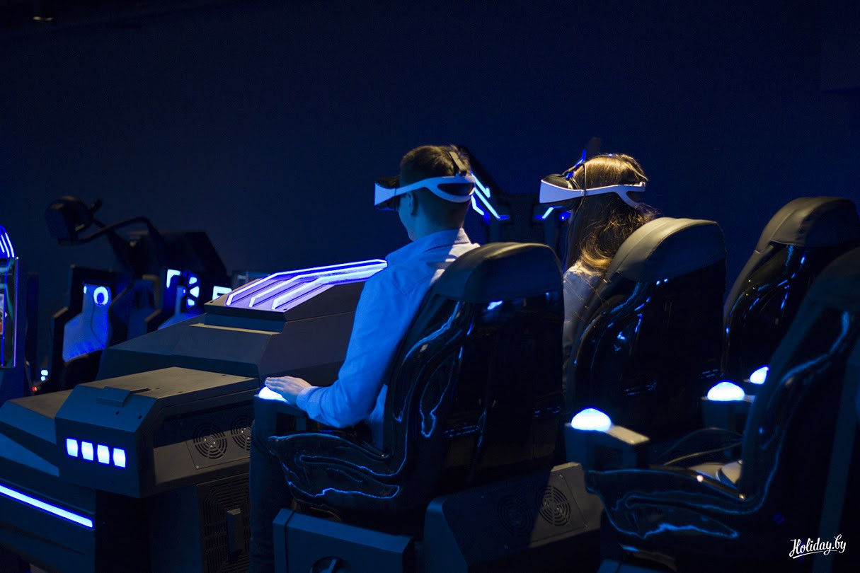 После турникетов перед вами открывается черно-синее пространство площадью в 1400 квадратных метров, где расположены 13 симуляторов на 18 посадочных мест. Каждый из них включает несколько игр. Все они, по словам создателей, уникальные для Беларуси и Европы разработки.