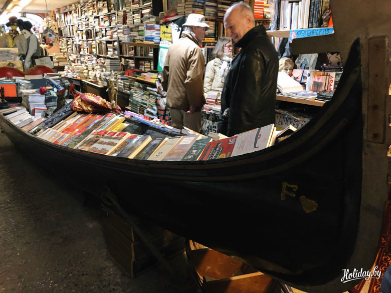 Как минимум, чтобы сфотографироваться в гондоле, а как максимум ухватить что-нибудь на память. Что интересно, большинство книг в магазине располагаются в ваннах, да, вы все правильно прочитали — в ваннах. В середине магазина расположена огромная гондола, до верху заполненная книгами. Сделано это не только как элемент интерьера, но и с вполне рациональным смыслом: если магазин затопит и все поплывёт, книги останутся сухими и просто уплывут в ваннах. Так что в сезон высокой воды не удивляйтесь плавающей гондоле с книгами по узким дорожкам Венеции.