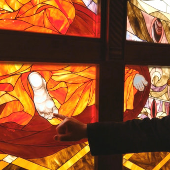 Справка: Витраж «Тайная вечеря» в «Храме Сошествия Святого Духа» в Мукачево двусторонний, имеет общую площадь 20 квадратных метров, состоит из более 10 000 кусочков и содержит около 40 кг свинца. Рисованные в витраже только лица, руки и ноги апостолов и Иисуса Христа. Непрерывная работа над ним заняла 4 месяца и своего рода «авторским правом» в ней есть одна из ног апостолов, которую автор рисовал по своей пятке и благословляющая рука Иисуса, в которой Юрий Варга (автор) зафиксировал руку настоятеля, отца Василия.
