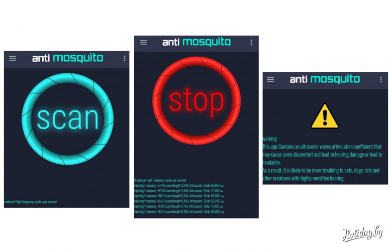 Вечер, романтика, водная гладь утопает в закате, вы смотрите с любимым человеком друг другу в глаза… Как вдруг воздух разрезает звонкий удар ладони: метким хлопком убит комар. И ещё один. И ещё. Вдали по-шамански размахивает руками поздний рыбак – он солидарен с парой. Чтобы избежать подобных моментов, разработчики мобильных приложений придумали революционную «аппку» - Anti Mosquito. По задумке, вы нажимаете одну-единственную кнопку, которая запускает работу ультразвука, способного отогнать от вас всех мошек, комаров и, судя по всему, дельфинов. Приложение предупреждает: ультразвуковые волны способны вызвать у Вас головную боль, а также побеспокоить котов, собак и прочих существ с высокочувствительным слухом. Мы испытали приложение на себе и на домашних животных: собаки продолжают спать крепким сном, головная боль так и не пришла, однако комаров, как и обещал «Антимоскит», рядом не было (хорошо, что на улице 5 градусов тепла).