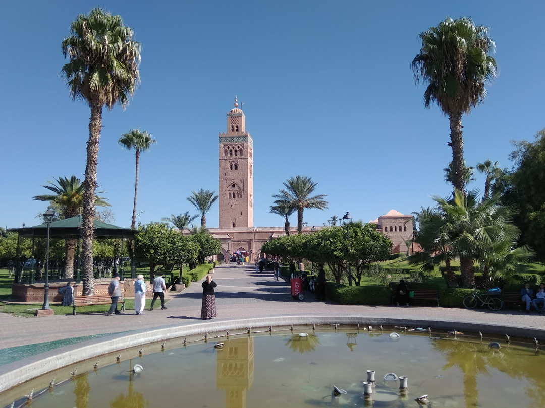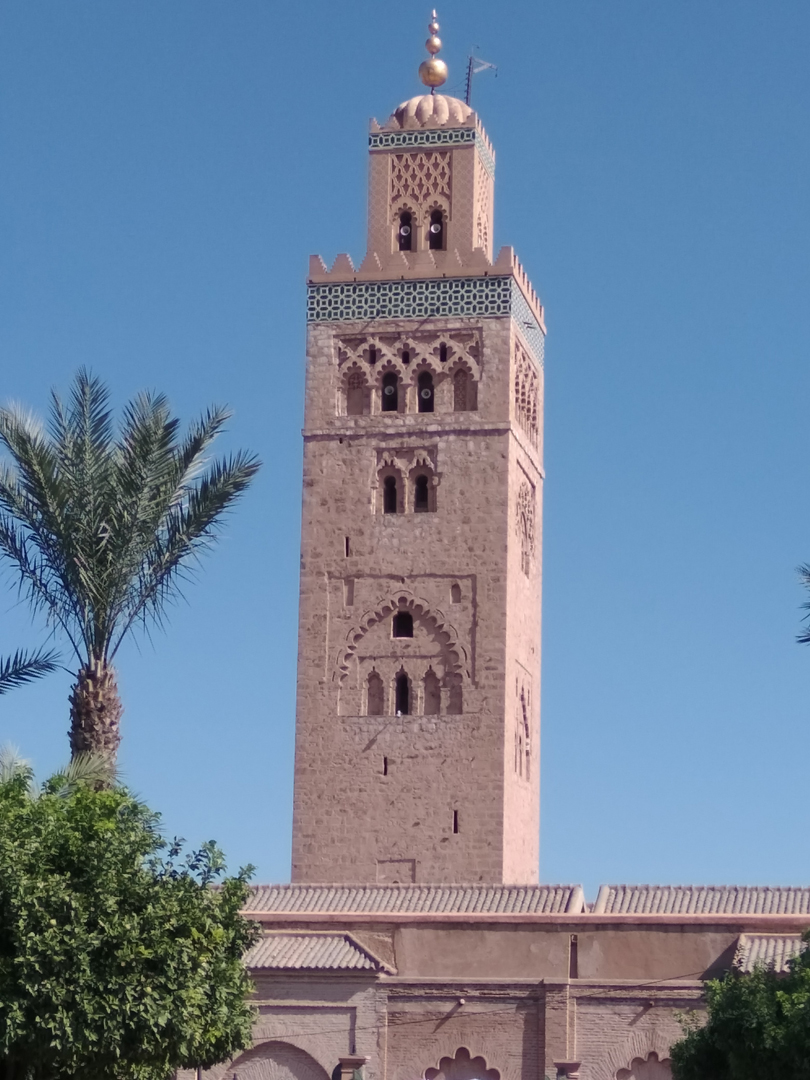 Дальше мы продолжили свой путь, чтобы увидеть бывшую в своё время школой, университетом и библиотекой, великолепную мечеть Аль-Кутубия со 112 колоннами, пятью золотыми куполами, виднеющимися из любой точки города. Существует легенда, что четвёртый из этих куполов был сделан из золотых украшений одной из жён султана, которая отдала их, поскольку нарушила пост Рамадан, съев днём несколько виноградин. Высота мечети достигает 77 м, а вместимость до 25 тысяч человек. Внутрь её туристы не заходят, зато можно прогуляться в великолепном саду вокруг здания.