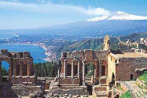 За шикарными видами в Греческий театр в Таормине. Любоваться природными декорациями лучше всего с трибуны античного театра. Панорамный вид на Таормину украшают высокие скалы, берег моря, дома местных и дымящаяся гора – это вулкан Этна приветствует зрителей театра.