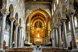 За яркими красками в Кафедральный Собор в Монреале. Кафедральный собор основан сицилийским королем. 130 мозаик на темы Ветхого и Нового заветов украшают стены храма, образуя единый повествовательный цикл. Авторы мозаики добились удивительного оптического эффекта – кажется, что очи Христа обращены на каждого из молящихся, а широко распростёртые руки обнимают всех находящихся во храме.