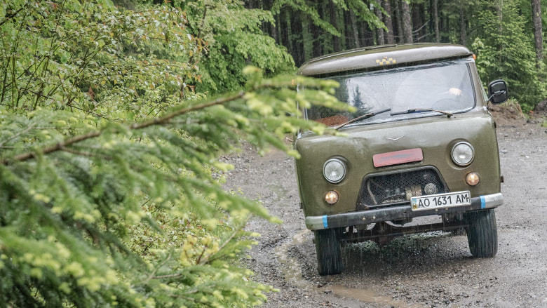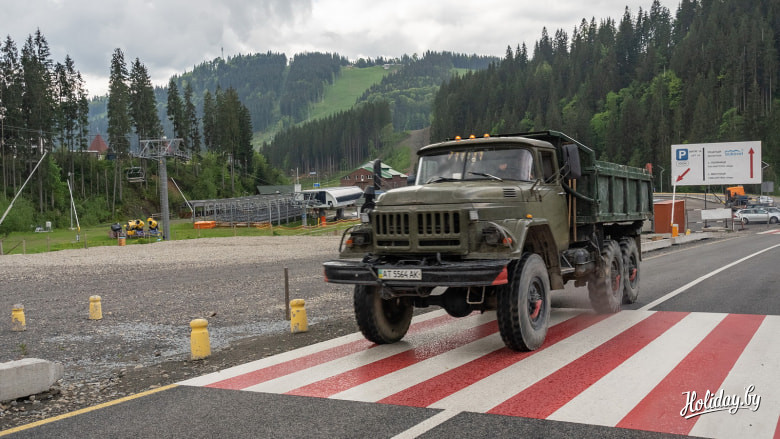 Из Буковеля в Драгобрат дорога проходит через КПП при въезде в Закарпатье. Какое-то время дорога сносная, но вот заправка, на которой можно залить в бак АИ-80 как бы намекает. Дальше и выше на дорогах будет чаще встречаться техника типа «Урал», ГАЗ-66 «шишига» и УАЗ-452 «буханки». Последние в Украине называют «таблетками».