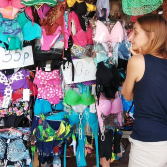 Меня (вернее, мое альтер-эго, которое отправилось закупаться) интересуют купальники. В лоб пулемётной очередью летит информация: есть закрытые и открытые, от 30 до 65 рублей, всё фирменное и только что привезенное «оттуда, откуда нельзя называть». И, конечно, что на мне будет смотреться все просто идеально, но идеальнее всего – вон тот купальник за 60 BYN. Однако, ориентируясь на среднюю зарплату в Беларуси, я вежливо отказываюсь от роли Афродиты в рюшах и перевожу взгляд на нечто более приземленное. Например, за 30 рублей вполне можно почувствовать себя русалкой.