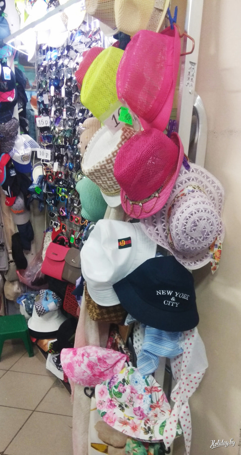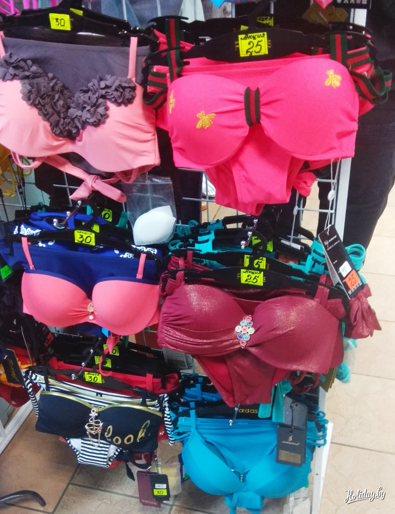 Купальники здесь, под открытым небом, стоят также в пределах 35-40 рублей. В крытых павильонах цены могут доходить и до 60 BYN. Заинтересовал нас и такой товар, как парео – пляжный платок для того, чтобы не сгорали плечи, а образ выглядел завершённым. Нашли на любой вкус и цвет всего за 10 рублей.