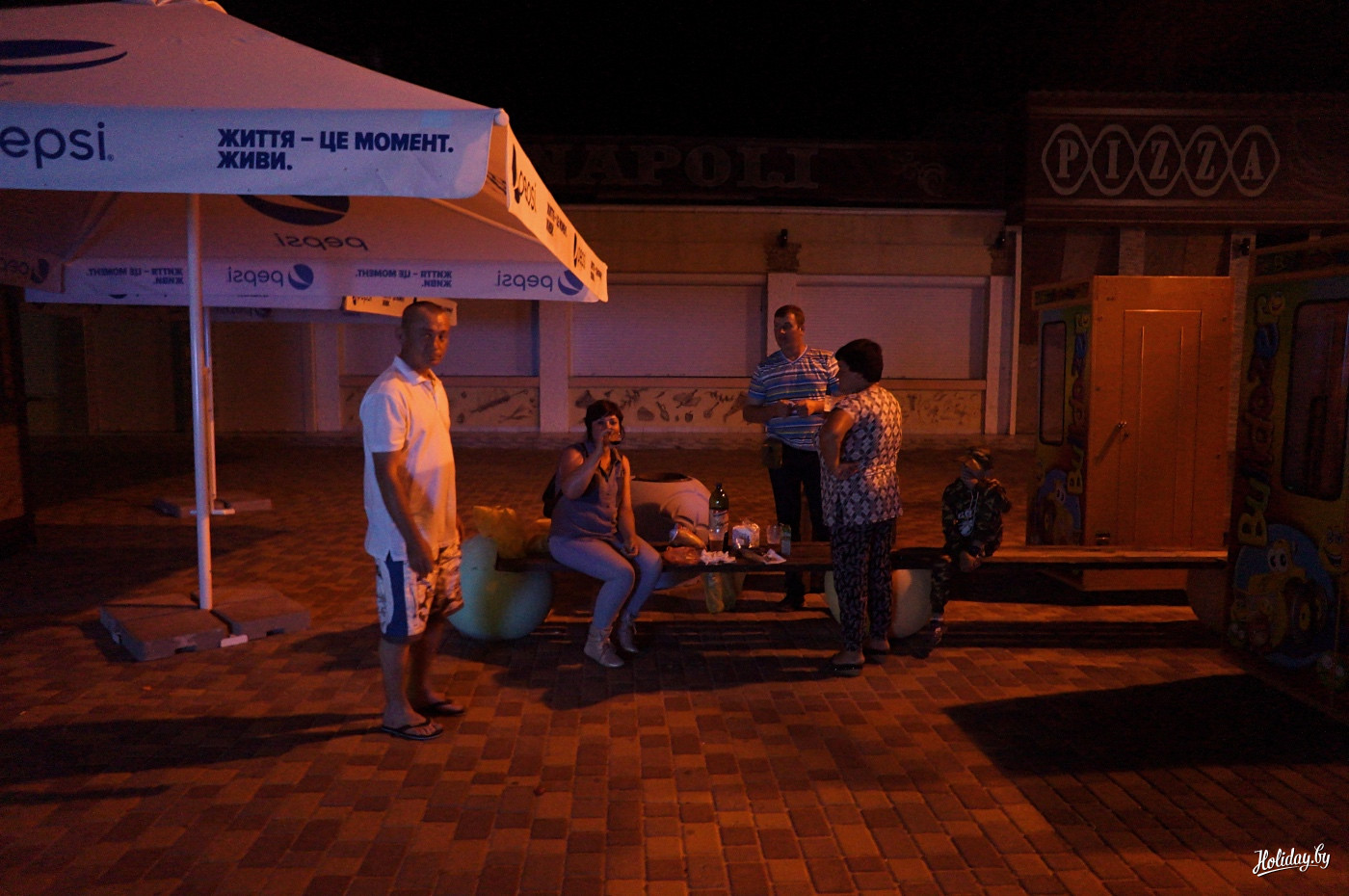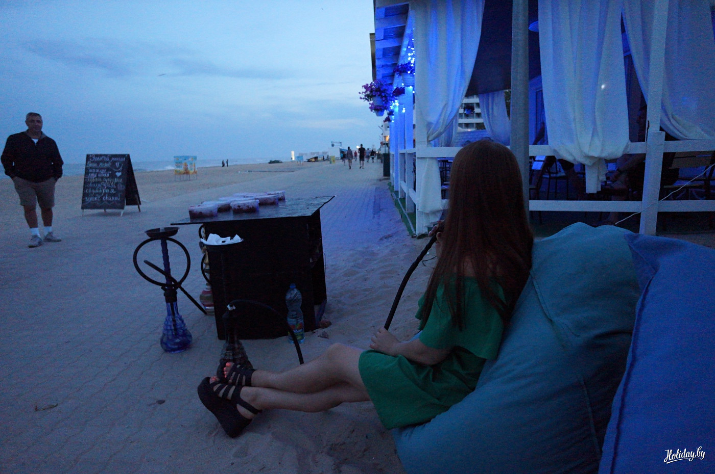 Фонари не горят. По променаду практически в полной темноте гуляют наполненные алкоголем и хорошим настроением люди. Им классно. Шумит море. Какие-то парни прямо на пляже оборудовали себе chill-out зону с кальянами. Приглашают всех проходящих мимо дам выпить вина.