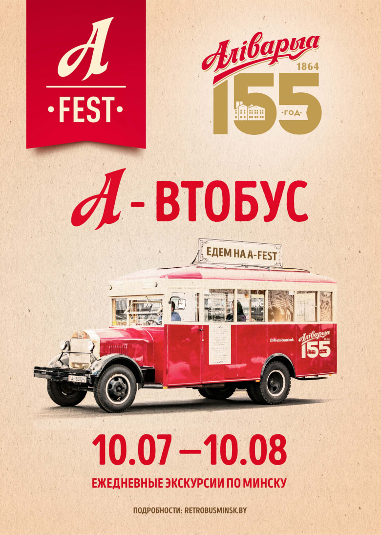 — Мы не случайно сделали ретро-автобус №155 живой афишей A-Fest. В этом году нашей компании исполняется 155 лет. Ставший уже городской традицией фестиваль мы посвятим истории пивоваренной компании “Аливария”, без которой невозможно представить историю Минска, — рассказали в “Аливарии”. — С 10 июля по 10 августа включительно А-втобус будет курсировать по центру столицы с обзорными экскурсиями. Пассажиры познакомятся с историей города и достопримечательностями, а также узнают, чем будет в этом году удивлять новый A-Fest.