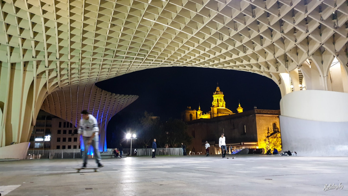 Побывать на самой необычной обзорной площадке в Севилье. Представьте, что в центре старого города расчищают место под очередной торгово-развлекательный центр и вдруг находят там древний город. Археологи отстаивают решение об остановке дальнейших работ. Тупик? Так в 2011 году в Севилье прорастают «грибы». Метрополь Парасоль – необычная конструкция из бетона и дерева, которая расположена в самом центре старого города Севильи. Конструкция вмещает в себя «Антиквариум» с теми самыми римскими и мавританскими артефактами, фермерский (недешёвый – авт.) рынок.