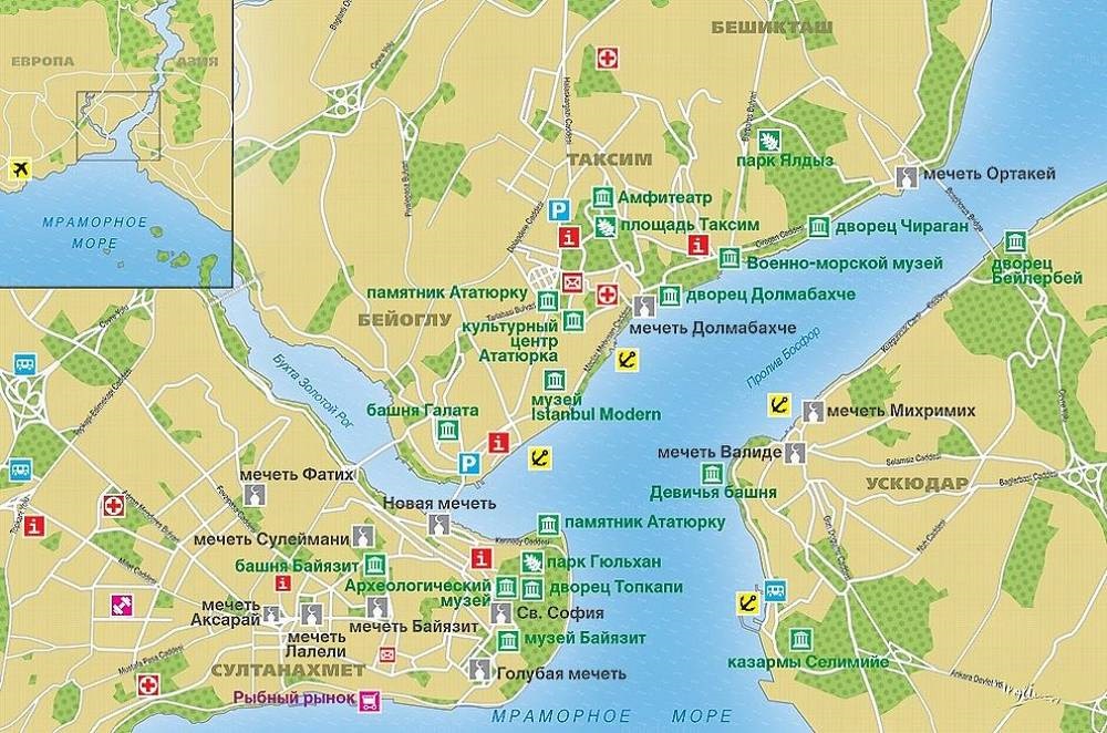Что касается осмотра основных достопримечательностей, то в этом плане Стамбул довольно простой. Все самые топовые места — Голубая Мечеть, собор святой Софии (Айя-София), Дворец Топкапы, и ряд других находятся в районе Султанахмет недалеко друг от друга и их можно легко обойти пешком.