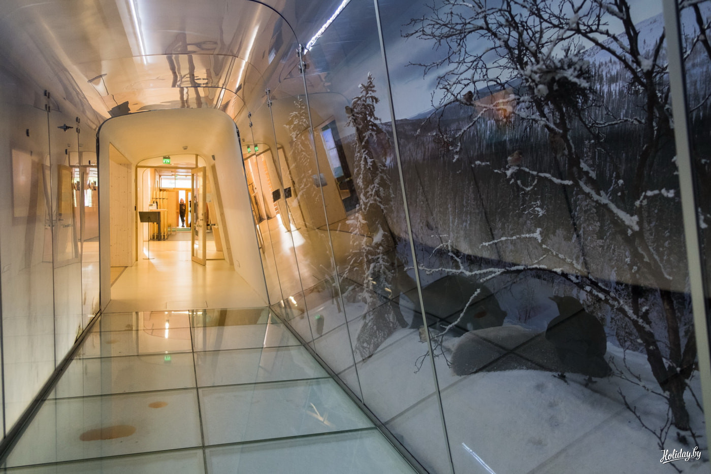 Здесь ты сперва идёшь по снежному каньону, попадая в огромный зал с видеомониторами. На них при тебе меняются поры года, а за спиной поражает воображение северное сияние. Хочется уйти в природу с головой? Нет проблем.