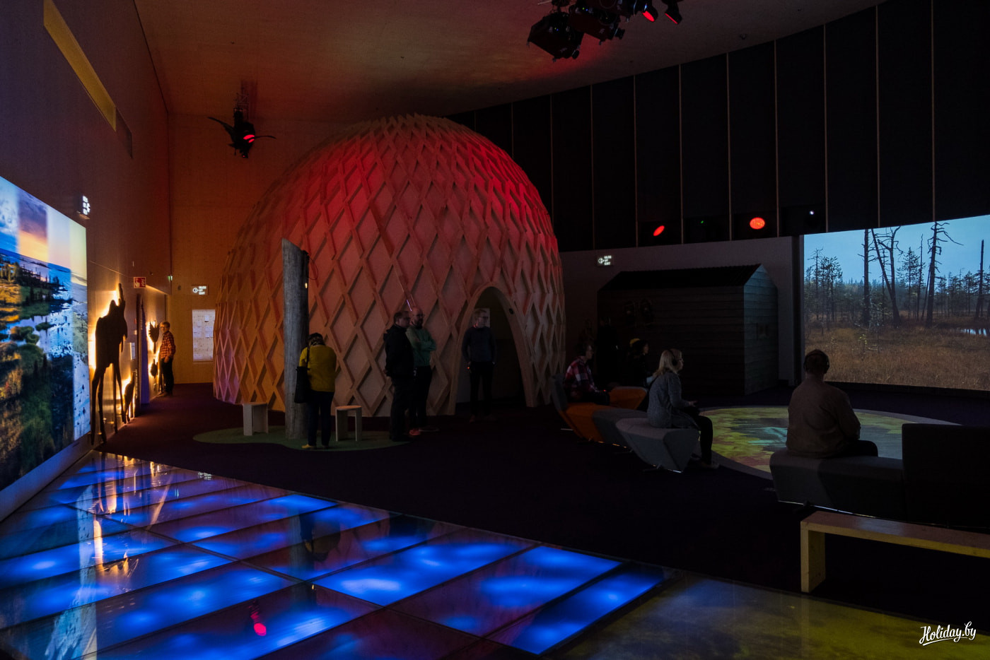 Сам центр небольшой по изначальной задумке архитектора. Он достаточно тесный, чтобы создать отсылку к путешествию по огромному утиному яйцу к центру мироздания согласно финского эпоса «Калевала», а также чтобы продемонстрировать задачу мирного и щадящего отношения человека к природе. Постройка внутри обшита многослойной фанерой: ее светлый цвет должен напоминать о сердцевине дерева, а рыжие доски фасадов – о его коре. Не просто так это здание было удостоено премии Finnish Wood Award 2013 за инновационное применение древесины в строительстве и архитектуре. Именно это решение делает необычными ощущение от пребывания в центре.