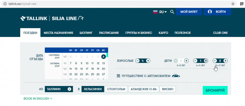 Сайт этой круизной компании идеально работает на русском языке и интуитивно понятен (в отличие от приложения к эстонским электрозаправкам для автомобилей оператора ELMO). На нём достаточно осуществить базовые действия – выбор количества людей и машин, получить актуальную цену и забронировать билет – дальше всё становится ещё более удобным в мобильном приложении.