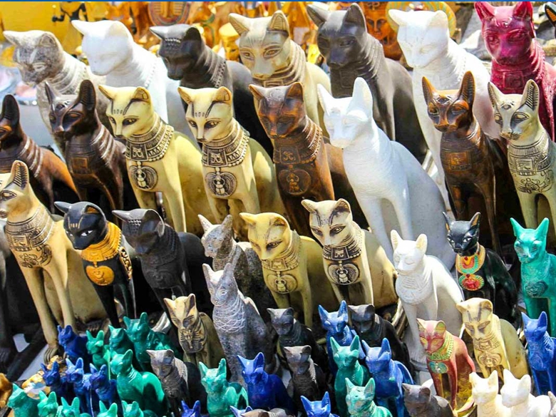Статуэтки в виде жука скарабея, папирус, мочалки из люфы, благовония, бутылки из декоративного стекла, сувениры из оникса.